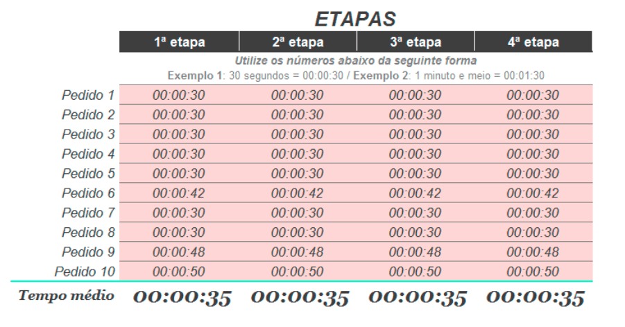 - Tempo observado: tempo que o operador utilizou para cada etapa do pedido.